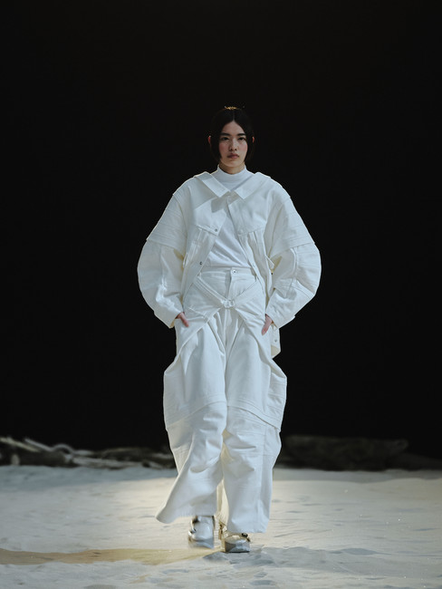 LOOK19からは月から地球へショー会場が変わります。モデルたちが月の光に照らされた砂浜を歩きます。その時に身に纏っているのは月面で着ていた服と同じものですが、地上では重力の影響を受けてボリューミーだった膨らみが萎み、そのシルエットは一変します。キルティングドレスやコートの肩やジャンプスーツのウェストラインは落下し、ドレープやギャザーが服に生まれます。宇宙服が地球服に変わり、コレクションはフィナーレを迎えます。