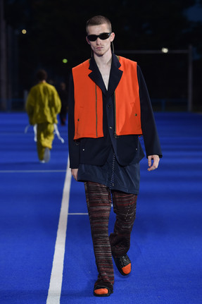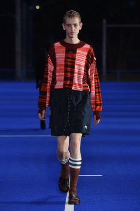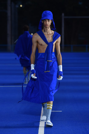 デザイナーの趣味であるフットボールの試合後のユニフォーム交換がインスピレーション源となったコレクション。たとえば、異なる体型の選手間で“交換”されたユニフォームは、それぞれのアンバランスなシルエットを生み出します。さらに、アンダーシャツやトレーニングウェアとのレイヤーからは、試合後のほんの10分間だけ目にすることができる新鮮