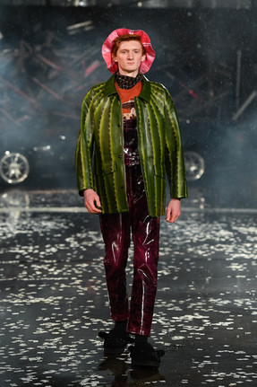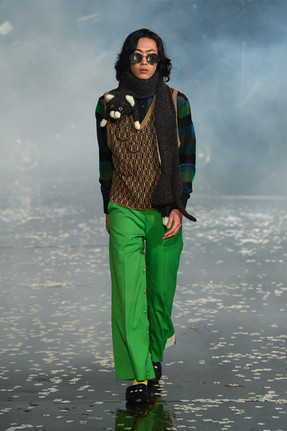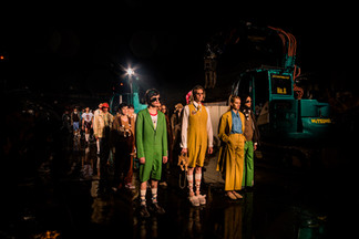 逆再生のコレクションムービーでは、本来であれば、かっこよく歩けるはずのモデルが後ろ歩きのため、ぎこちなく進んでくる。重機により解体されたものが元に戻っていく。デザイナーは、かっこ悪くとも前に進んでいく、これからの未来に向けた再生の物語をスタートさせた。