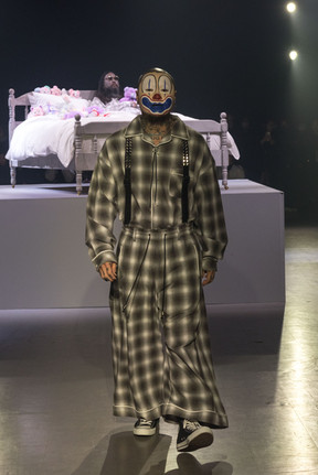 デザイナーがここ半年の間に頻繁に見る悪夢がテーマとなったコレクションには、死神やピエロに扮したモデルも登場。スカルのモチーフやZIP、スタッズなどロックなテイストは健在。