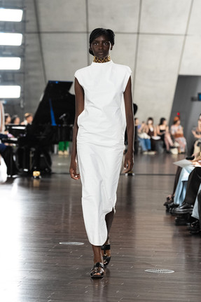 静謐なラインにフォーカスを当て、目に見えない真実を視覚化するためのアプローチは、石から削り出されたようなフォルムと素材で輪郭を象るドレスに始まり、磨き上げられたブロンズのように滑らかな仕上げのボンディング素材や、柔らかな布の流れの一瞬をその場に