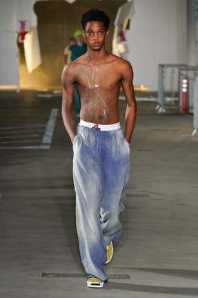 古着カルチャーが深く根付く⼤阪の地で、ヴィンテージ/アーカイブと現⾏品をミックスさせるファッションカルチャーに強い影響を受け、ヴィンテージショップで販売キャリアを重ねたデザイナー。服作りにおいて、いかにリアリティをもってストリートで消化できる服であるかという意識を強くもつ神谷が今回初のランウェイショーで披露したのは、過去の自分が愛した古着をベースにしつつ、 現代の最新技術を用いた加工を随所に施したアメカジスタイル。