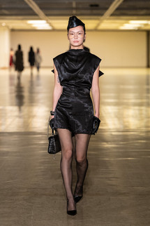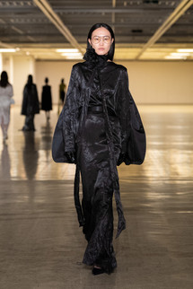 前から見るとシックなドレス、セットアップですが、後ろにジャケットやコートを背負っているようなスタイルになっています。シルクサテンのドレスやナイロンのトップスはいわゆる裏地で作られており、ジャケット、コートの表地と裏地の間に体を滑り込ませたように見える構造になっています。