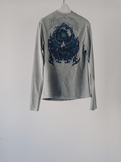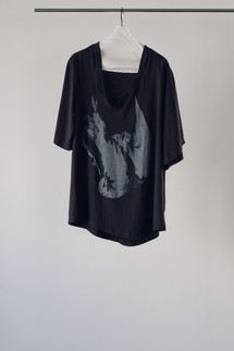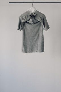 FW15のデビューコレクションでのロゴをプリントしたTシャツ。FW20のdeadbodysuit(5枚の古着Tシャツを⽤いて作られたボディスーツ)のシェイプを参照してデザインしたニューカットソー。FW20のdouble knee skirtをソースのワークパンツに戻し、ヒップを削り裾を出したニューシルエットのデニムパンツ。FW21よりモディファイした、襟のリブが内側に捲れ込むMA-1、袖や襟⾸が歪んだパーカーやカットソー。全11型がラインナップします。