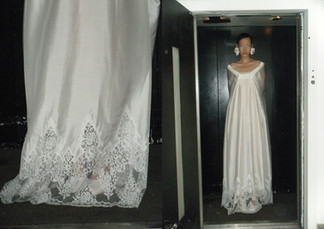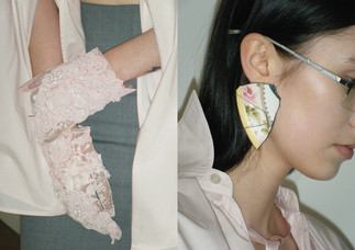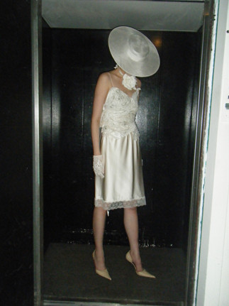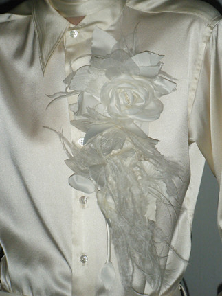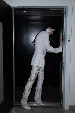 前後逆さにして襟を折り畳まれ身頃の形状が崩れたシャツは、重力に逆らって凛々しく襟の立ち上がるフォルムが奇妙で、萎びた百合の花弁のような脆く艶めかしい不安定さを放っている。淑女たちが纏っていた鋭い緊張感は萎びて寂し気な色気を帯び、冷たさと温かさ、あるいは質素と華美といった、相反するイメージの間を揺蕩う。