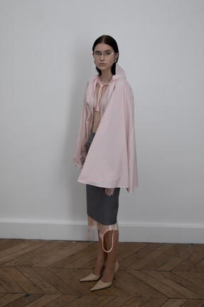 昨シーズンの象徴的なアイテムであるジャケットの首元を留めるブローチが外れ、胸元がはだけて裏地が心もとなく泳ぐさまを偶然目にした吉田は、意図しない形でデザインが崩れたアンコントロールで曖昧な柔らかさに心地よさを感じ、布が撓むようなシェイプの可能性を探り始めた。