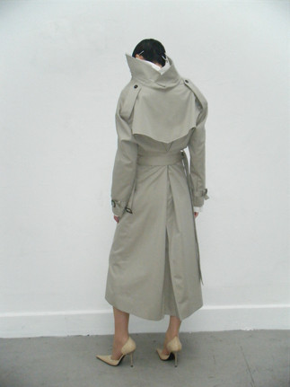 ジャケットやコートの後ろ襟を立て折り紙のように畳み、前身頃も内側に畳み込む。巾を失った前身頃を無理やり留めると胸元に隙間が生まれ、首元やウエスト、肩回りに引き皺が現れる。まろやかでどこか侘しさをも感じさせるこのシェイプは、本コレクションを通じて多用されている。