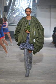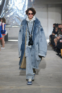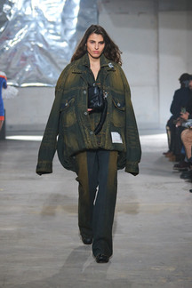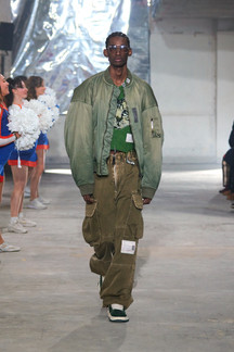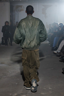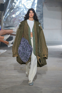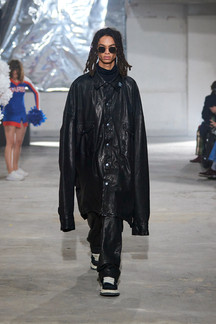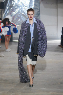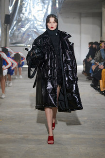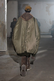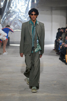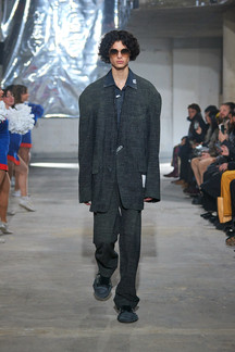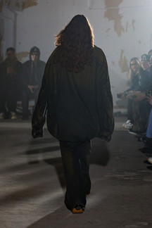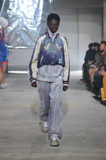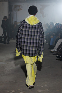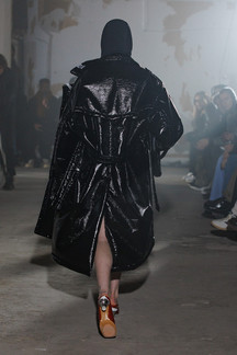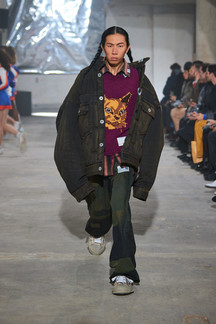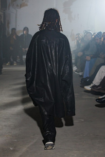 本コレクションでは三原にとってインスピレーション源のひとつである夜の世界が生彩を放つ。艶感のあるエナメル地のフェイクレザー、燦然と輝くテープ糸のウィメンズニットなど煌びやかな新素材も登場し、無秩序な夜のムードを昂らせる。