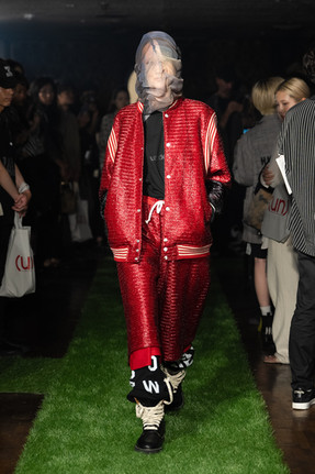 今シーズンはアニメ『新世紀エヴァンゲリオン』とのコラボレーションでプリントTシャツなどを制作。作中に登場するバリア「A.T.フィールド」をイメージして開発された、ナイロン扁平糸を編み上げたバリアのような素材などもランウェイに登場した。