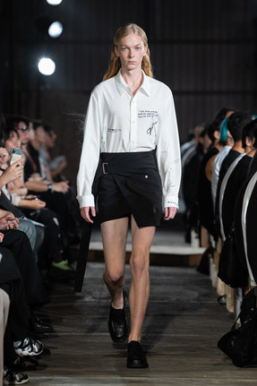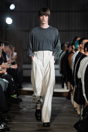 ラーをモノクロームからダスティカラー、生成りに限定しながらしわや穴あきの加工、ドローイングのプリントで生地にアクセントをつけた。巧みなスカーフ使いは今夏にも取り入れたいスタイリングテクニックだ。「構造そのものがデザインになる」というブランド哲学を随所に感じられるコレクションが披露された。