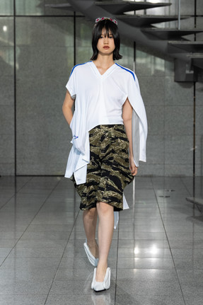 冒頭のラグビーボールを模したドレスやジャージやユニフォームのようなスポーティーなアイテムは部活からのイメージ。ドラクエのスライムのような光沢感のあるドレス。終盤に登場するのは、今や「思い出せない父の車」と、未来を象徴する「憧れのテスラ」。ラストルックのベールにプリントされた父との思い出の写真は、これまで家族とあまり向き合ってこなかったというデザイナーからの精一杯のメッセージだった。